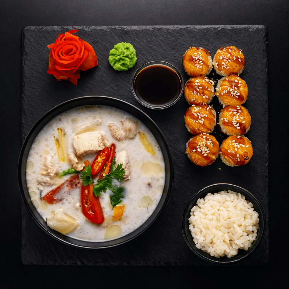 Суп Том Кха с курицей, Маки запеченные с креветкой, имбирь, васаби, соевый соус.