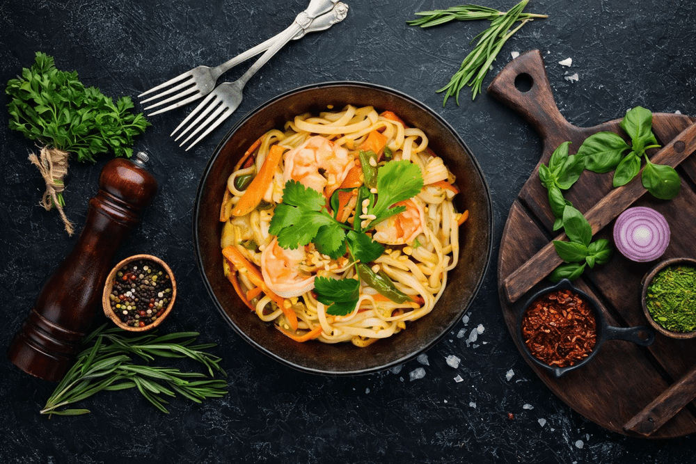 Соус Том Ям, креветки тигровые, куриное филе, шиитаки, лук, морковь, арахис, зелень.