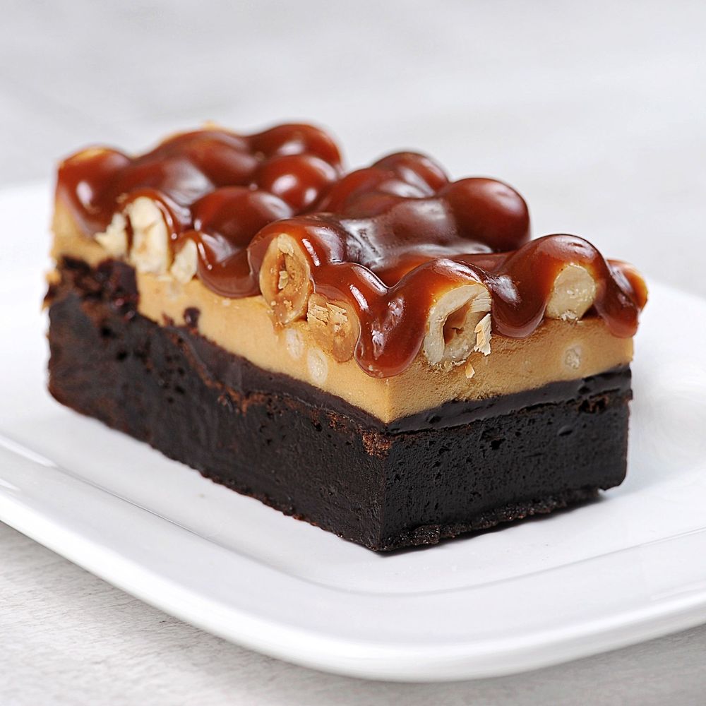 Шоколадный брауни с тянучкой из сливочной пасты, покрыт толстым слоем мягкой сливочной карамели и лесным орехом.
