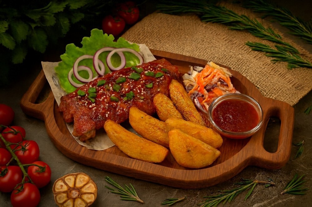 Сочные свинные рёбрышки в томатном-чили соусе, подрумяненные до идеальной корочки. Подаются с кортофелем по-деревенски, салатом из всежей капусты и томатным соусом чили.