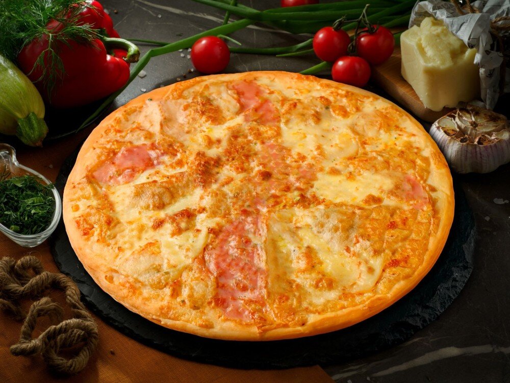 На тонком тесте - сочные кусочки курицы, мягкая ветчина и растопленный сыр, который тянется с каждым кусочком. Такая пицца подойдет как взрослым, так и детям.
