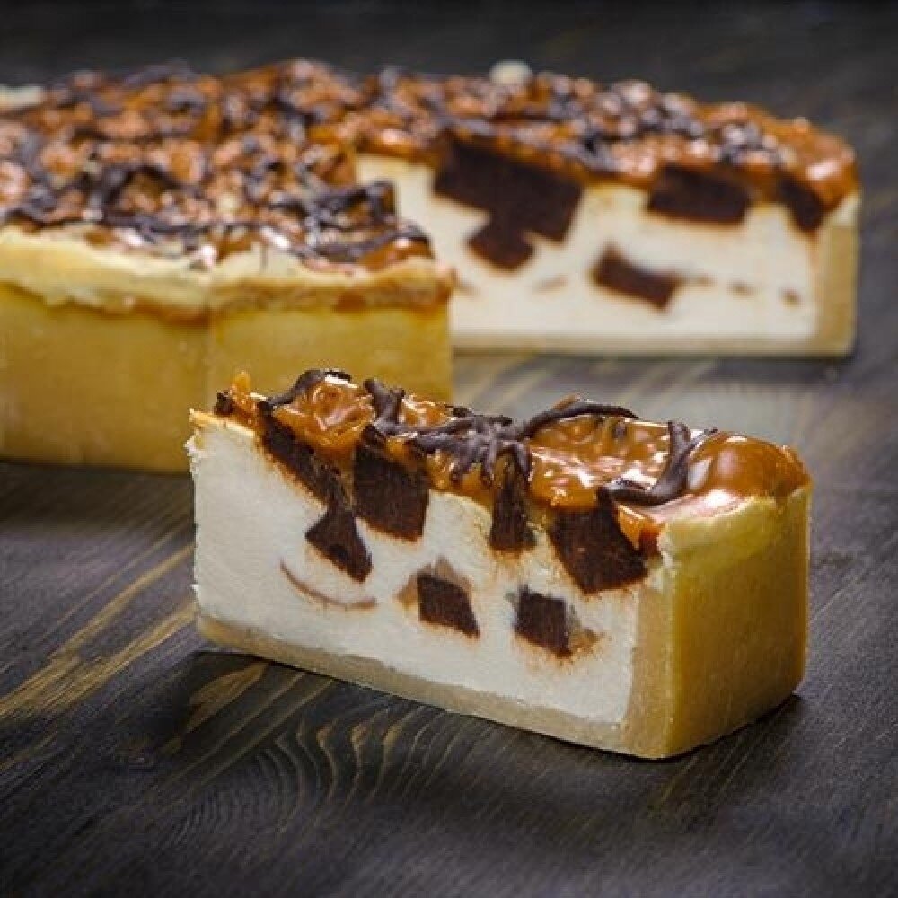 Чизкейк “С брауни и карамелью” — десерт сочетающий нежную сливочную основу, кусочки шоколадного брауни и тягучую карамель. Богатый вкус, кремовая текстура и сбалансированная сладость