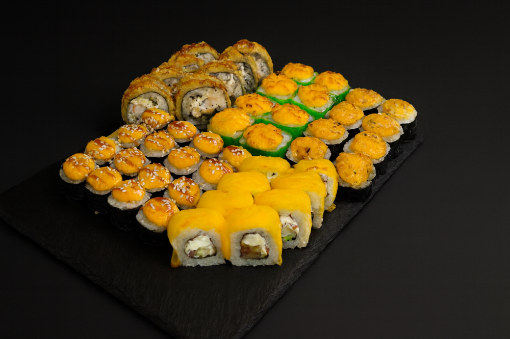 Чикен Чиз ролл, Хакуен ролл, Дакато ролл, Драгон ролл, Маки запеченные с крабом, Маки запеченые с лососем.
