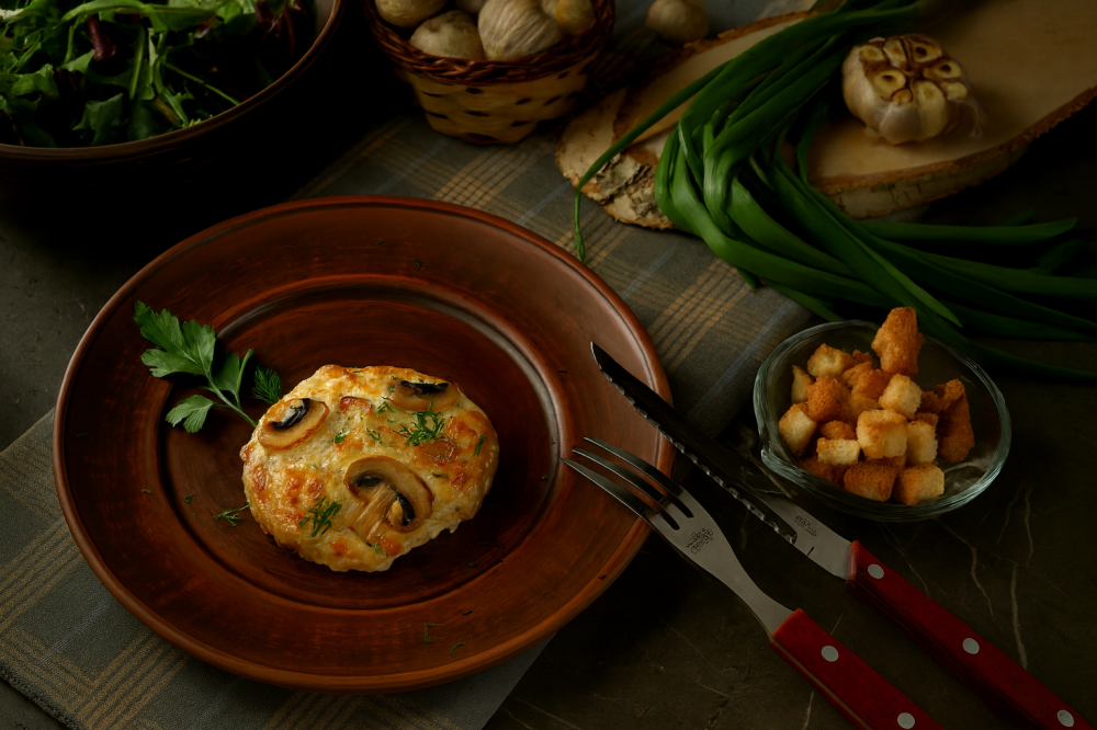 Нежный куриный медальон, запечённый до идеальной сочности, покрыт тянущейся моцареллой, которая создаёт мягкую сливочную корочку. Ароматные шампиньоны и сладкие помидоры добавляют блюду глубину и лёгкую свежесть, создавая гармоничное сочетание текстур и ароматов.