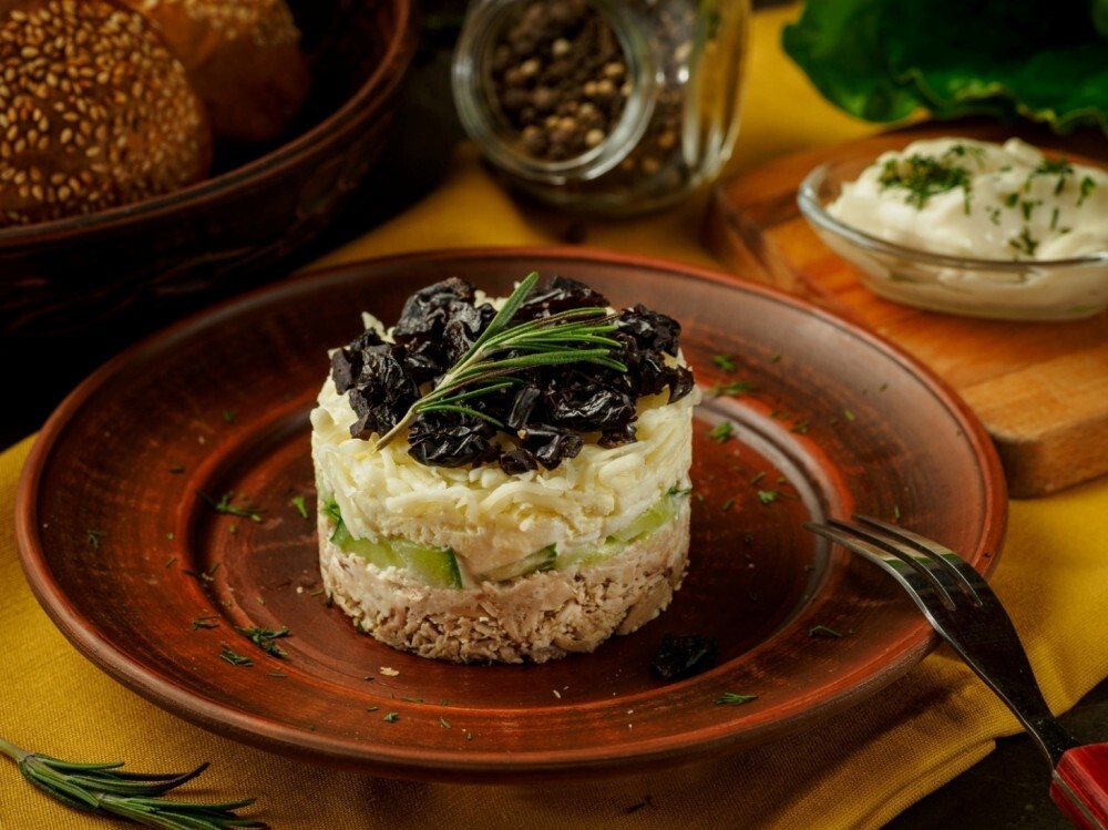 Салат с куриной мякотью, огурцами, яйцом, черносливом и моцареллой - нежный и сбалансированный салат с интересным сочетанием текстур.