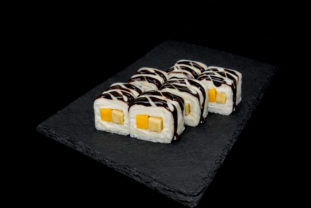 Лёгкий фруктовый десерт, завёрнутый в прозрачную рисовую бумагу. Внутри - сладкие кусочки манго и банана, дополненные нежным сливочным сыром с гладкой текстурой. Сверху ролл украшен шоколадным соусом и сгущенным молоком.