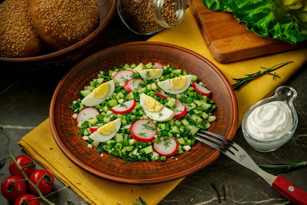Свежий салат из хрустящего редиса и огурца, дополненный нежным яйцом и ароматной зеленью. Подаётся со сметаной, которая делает вкус мягким и гармоничным.