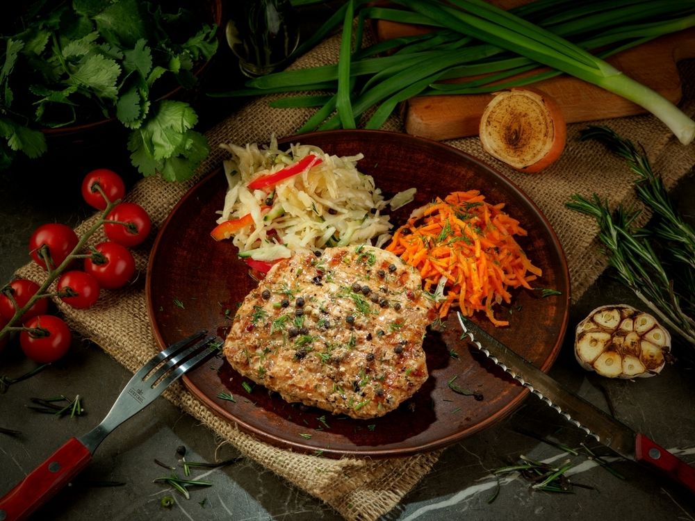 Сочная свинина в пряном маринаде, приготовленное на открытом огне с гарниром из овощного салата и морковью по-корейски.