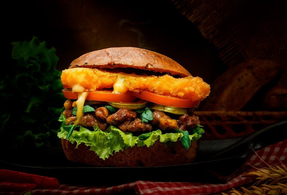 Тамбургер с нежнейшими кусочками мраморной говядины, сыром Чеддер, соленым огурчиком, помидорами, рукколой, листьями салата и мраморным сыром фри.